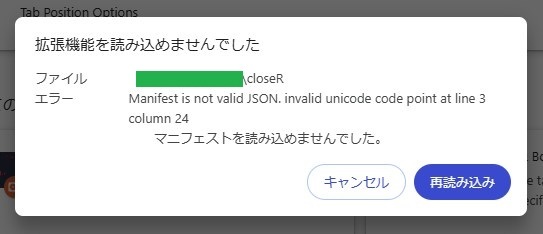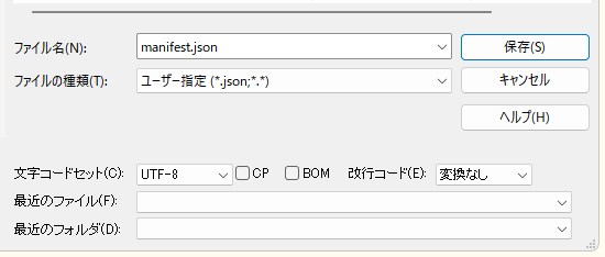 「manifest.json」ファイルは、UTF-8形式で保存する必要あり。