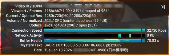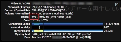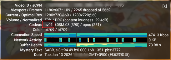YouTube動画を再生すると、基本的には自動でAV1(最高だが重い)になるのですが、