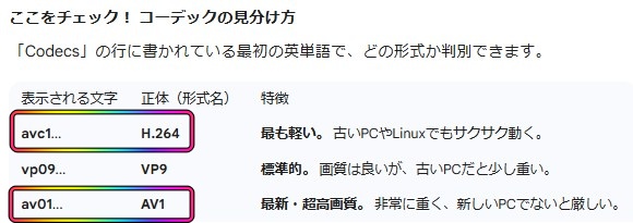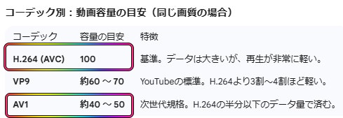 av01 と表示 = AV1 という形式 = 最新だが処理が重く、動画容量は小さい