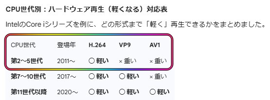 つまり、古いパソコンでAV1でYouTube再生すると、