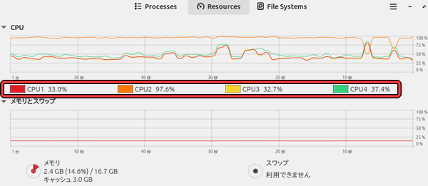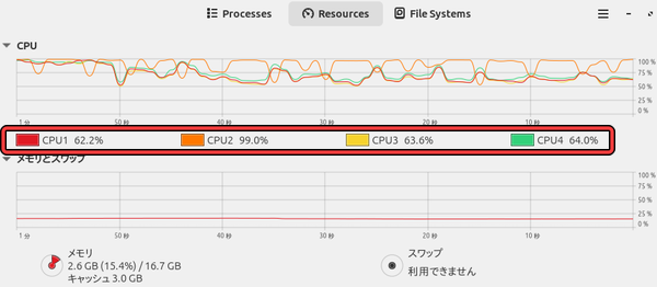 今回は、Linuxのシステムモニターを見ながら検証しました。