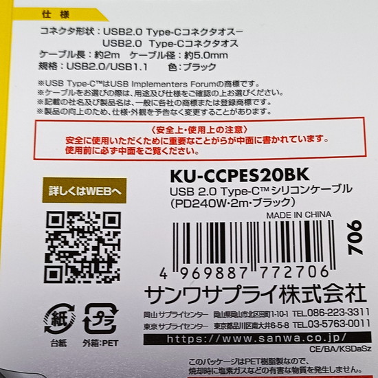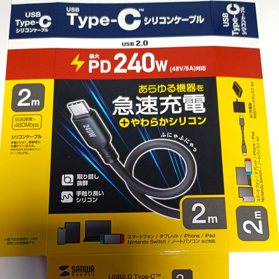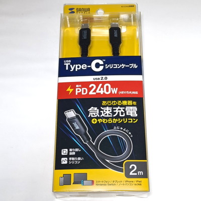サンワサプライ「Type-C シリコンケーブル PD240W 2m (KU-CCPES20BK)」を購入。シリコンはいいぞ。