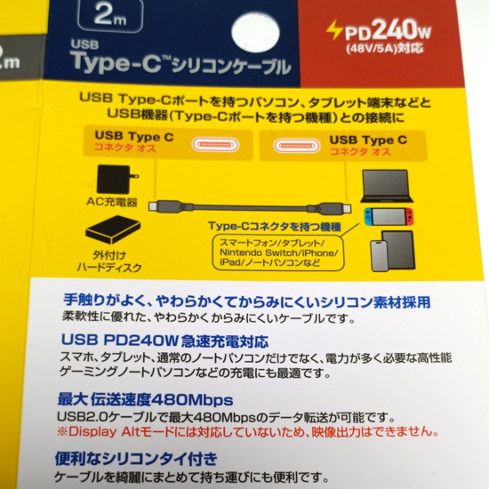 シリコン、PD急速充電240W対応、2m というてんこ盛りケーブル。