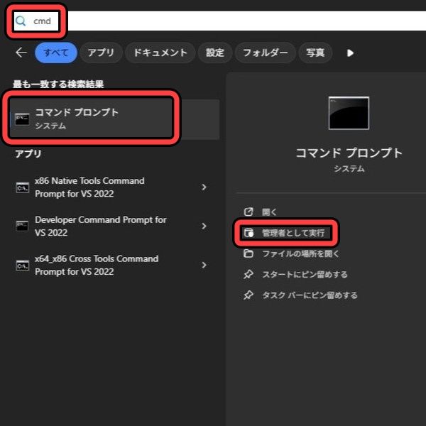 コマンドプロンプトの「管理者として実行」を選ぶ